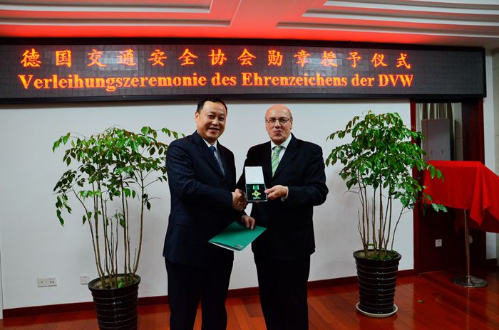 12月17日下午,在我院行政樓九樓東會議室,我院特聘教授、德國交通安全協會主席庫爾特?伯德維希代表德國交通安全協會授予我院黨委書記蔡敬民銀質二級勛章。德國交通安全銀質二級勛章是由德國聯邦總統授權,授予在交通安全領域做出巨大貢獻的人士。蔡敬民是獲得此項榮譽的中國第一人。伯德維希先生、我院院長張文兵、副院長陳嘯和與會師生對蔡敬民表示熱烈祝賀。蔡敬民在答謝詞中表示,這不僅是個人的榮譽,這也是以庫爾特?伯德維希先生為代表的德國交通安全協會對合肥學院中德合作辦學的肯定,合肥學院師生將以高度的社會責任感遵守、傳播、研究交通安全。授予儀式由張文兵主持。
