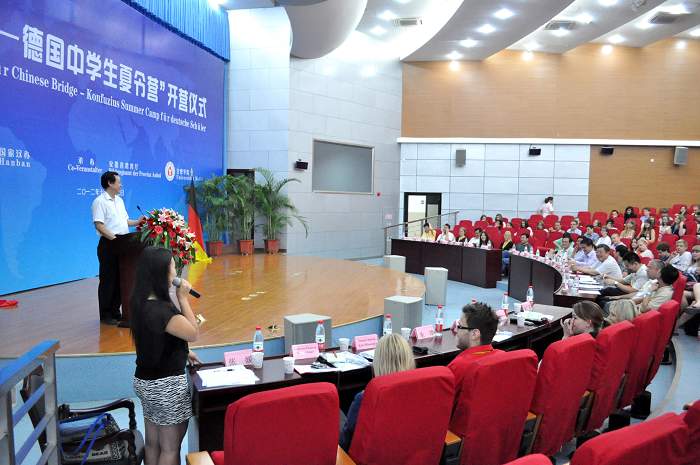 蔡敬民院長(zhǎng)主持開(kāi)營(yíng)儀式。安徽省教育廳總督學(xué)李明陽(yáng)、外事處處長(zhǎng)耿尊芳,德國(guó)漢諾威孔子學(xué)院院長(zhǎng)胡春春,中國(guó)駐德國(guó)大使館二等秘書(shū)修春民,合肥市教育局副局長(zhǎng)江浩以及來(lái)自各協(xié)辦單位的相關(guān)領(lǐng)導(dǎo)和老師出席了開(kāi)營(yíng)儀式。蔡院長(zhǎng)代表合肥學(xué)院全體師生歡迎參加2012“漢語(yǔ)橋德國(guó)中學(xué)生夏令營(yíng)”的德國(guó)師生。蔡院長(zhǎng)說(shuō),這是合肥學(xué)院繼2010年8月首次成功接待來(lái)自德國(guó)五所孔子學(xué)院的56名師生、2011年8月再次成功接待來(lái)自德國(guó)七所孔子學(xué)院74名師生后,第三次接待 “漢語(yǔ)橋德國(guó)中學(xué)生夏令營(yíng)”德國(guó)師生。我們將繼續(xù)做好漢語(yǔ)教學(xué)和服務(wù)工作,為大家創(chuàng)造良好的學(xué)習(xí)和生活環(huán)境。