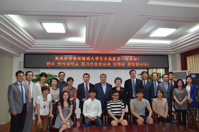 蔡敬民致歡迎詞,韓瑞大學(xué)與我院交流密切,是我院第一所友好合作的韓國大學(xué),至今,韓瑞大學(xué)與我校合作已有15年的歷史,我院先后派遣6名教師到韓瑞大學(xué)任教、5名教師赴韓瑞大學(xué)攻讀博士學(xué)位。韓瑞大學(xué)與我院派出的交換生、聯(lián)合培養(yǎng)學(xué)生已達到150名,韓瑞大學(xué)在我院學(xué)習(xí)漢語的學(xué)生超過100名,目前,有16位韓瑞大學(xué)交換生在我院學(xué)習(xí)漢語。蔡敬民還向客人介紹了我院辦學(xué)情況。