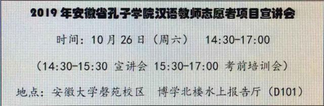 為推進(jìn)安徽省各高校孔子學(xué)院工作,宣傳漢語教師志愿者項目,方便廣大學(xué)生進(jìn)一步了解漢語教師志愿者的崗位要求和工作職責(zé),鼓勵更多的學(xué)生參與到漢語國際推廣事業(yè),孔子學(xué)院總部、安徽省教育廳、安徽省孔子學(xué)院師資培訓(xùn)基地和安徽大學(xué)將共同舉辦安徽省孔子學(xué)院漢語教師志愿者項目宣講會。