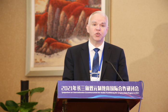 喬治·施泰德在題為《發(fā)展——合作——?jiǎng)?chuàng)新 過去、現(xiàn)在與未來》的報(bào)告中指出,高校是教育的核心部分,職業(yè)教育引領(lǐng)創(chuàng)新之路。中德合作由來已久,他希望能與更多高校建立良好的溝通合作關(guān)系,運(yùn)用雙元制教育模式,推動(dòng)人才培養(yǎng)方案改革創(chuàng)新,使學(xué)生的綜合能力和專業(yè)技能不斷提高,讓中國更多的職業(yè)院校受益。
