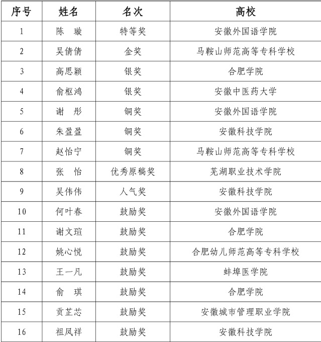 根據(jù)安徽省教育廳辦公室皖教辦函〔2021〕82 號《關(guān)于舉辦“第十四屆安徽省順天鄉(xiāng)杯韓國語演講大賽”的通知》安排,依據(jù)賽前公布的比賽規(guī)則,經(jīng)大賽組委會選拔評比,現(xiàn)將大賽結(jié)果相關(guān)事宜通知如下: