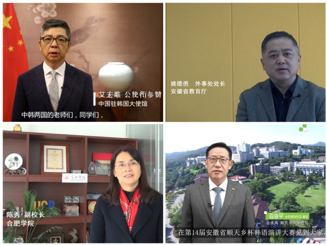 11月23日,由安徽省教育廳主辦、合肥學院和順天鄉大學承辦的第十四屆安徽省順天鄉杯韓國語演講大賽在我校成功舉辦。開幕式中,中國駐韓國大使館公使銜參贊艾宏歌、安徽省教育廳外事處處長姚德勇、合肥學院副校長陳秀和韓國順天鄉大學校長金承禹分別致辭。