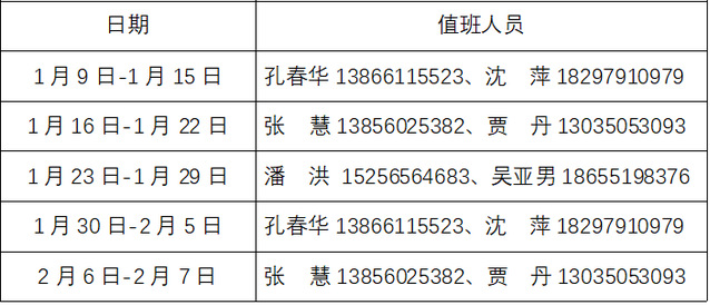 三、寒假期間安排值班,請各科室根據工作分工和學校重點工作合理安排時間 ,遇有突發事件,要按規定及時報告并妥善處置,確保學校安全穩定,具體排班表如下: