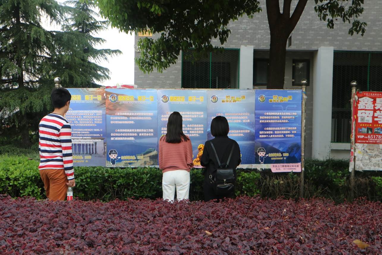 走進學校圖書館便可看見大屏幕上持續播放的宣傳視頻,吸引了很多學生駐足觀看;天橋兩邊和食堂門口等校園顯著位置均拉上了宣傳橫幅,在廣大師生中營造了濃厚的國家安全氣氛;學校主要的張貼欄區域張貼了國家安全教育系列掛畫,掛畫以豐富的繪畫和生動的解說,寓教于樂,讓廣大學生全方位學習到國家安全知識。