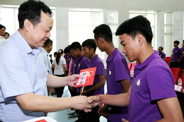 隨后,在與會(huì)各領(lǐng)導(dǎo)的見證下,解平與蔡敬民共同為柬埔寨留學(xué)生發(fā)放合肥學(xué)院入學(xué)獎(jiǎng)學(xué)金。開學(xué)典禮最后,蘇速卡議員與蔡敬民書記及劉忍會(huì)長(zhǎng)互贈(zèng)禮品,議員夫人孫蘇菲與張力芳副主任互贈(zèng)禮品,全體成員合影留念。至此,開學(xué)典禮圓滿落幕。