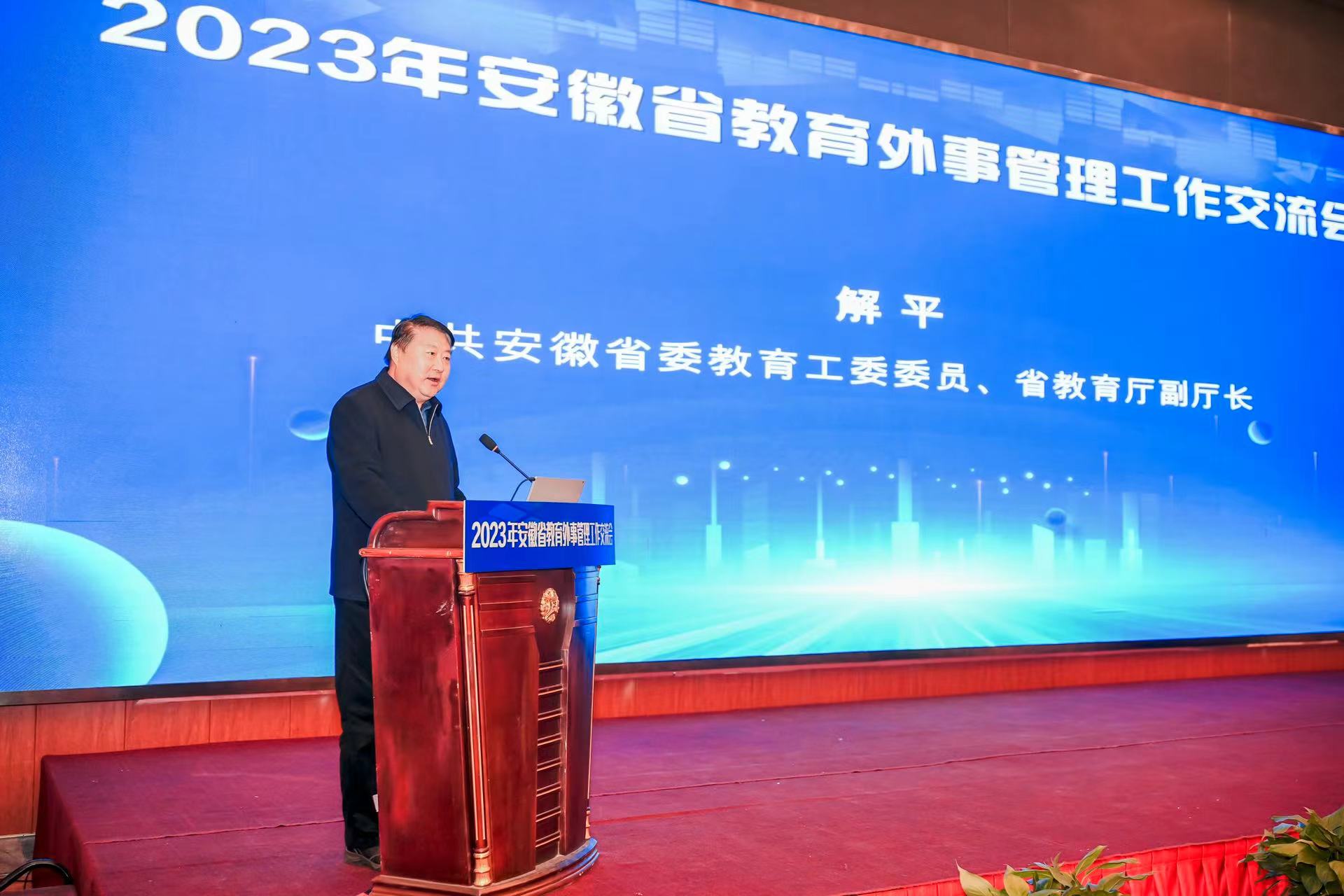 解平總結了近年來我省教育外事工作開拓創新和服務大局等方面取得的成績和亮點,分析了當前形勢和發展堵點,希望下一步全省教育外事領域切實提高思想認識,主動作為,服務國家總體外交大局,統籌好發展與安全,貫徹落實總體國家安全觀,加強業務培訓,強化教育外事工作隊伍建設,在教育部和省委省政府的關心和領導下,加快和擴大教育對外開放,不斷開創安徽教育外事工作新局面。