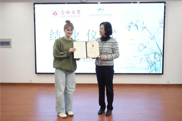 在結業儀式上,吳春梅校長給所有通過考核的學生頒發結業證書。吳校長勉勵德國學生,希望他們繼續學習中文和中國文化,歡迎他們來合肥大學留學,做中德合作的參與者和中德友好的使者。