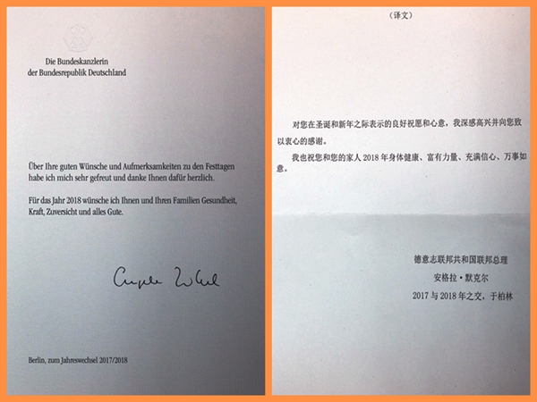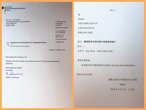 日前,黨委書記蔡敬民收到了由德國駐華大使館轉來的德國總理默克爾的問候卡。默克爾總理在信中表達了她對蔡敬民本人及學校美好祝福。她在信中寫到:“對您在圣誕節和新年之際表示的良好祝愿和心意,我深感高興并向您致以衷心的感謝。我也祝您和家人2018年身體健康、富有力量、充滿信心、萬事如意。”德國駐華大使館在信函中表示,“我謹請隨信轉交德意志聯邦總理值歲末年初之際寄送的問候卡,順致友好的問候!”據悉,這是學校第4次收到默克爾總理親筆信。
