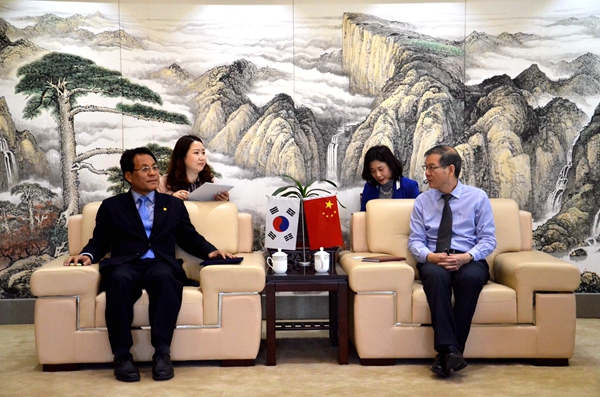 4月17日,韓國韓南大學校長李真薰一行來訪我校,合肥學院黨委副書記、校長王其東于行政樓八樓貴賓室會見來賓,國際交流合作處處長賈峰,副處長張慧,中國語言文學系副主任丁增武等陪同會見。