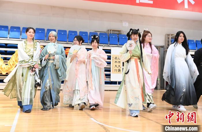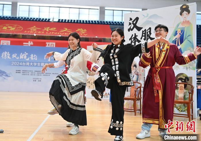 7月5日,在合肥大學(xué)南艷湖校區(qū),臺(tái)灣學(xué)生身穿民族服飾走秀。當(dāng)日,2024年皖臺(tái)青年交流活動(dòng)啟動(dòng)儀式暨臺(tái)灣大學(xué)生徽文化夏令營開營式在合肥舉行,來自臺(tái)灣的70余名青年師生走進(jìn)合肥大學(xué),體驗(yàn)傳統(tǒng)文化。