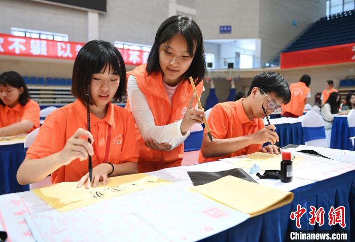 7月5日,在合肥大學(xué)南艷湖校區(qū),臺(tái)灣學(xué)生(左)在學(xué)習(xí)寫毛筆字。當(dāng)日,2024年皖臺(tái)青年交流活動(dòng)啟動(dòng)儀式暨臺(tái)灣大學(xué)生徽文化夏令營開營式在合肥舉行,來自臺(tái)灣的70余名青年師生走進(jìn)合肥大學(xué),體驗(yàn)傳統(tǒng)文化。