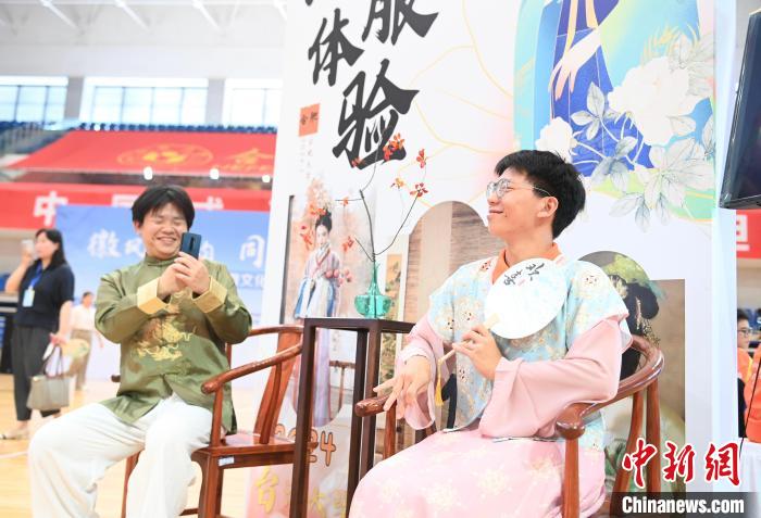 7月5日,在合肥大學(xué)南艷湖校區(qū),臺(tái)灣學(xué)生身穿民族服飾拍照打卡。當(dāng)日,2024年皖臺(tái)青年交流活動(dòng)啟動(dòng)儀式暨臺(tái)灣大學(xué)生徽文化夏令營開營式在合肥舉行,來自臺(tái)灣的70余名青年師生走進(jìn)合肥大學(xué),體驗(yàn)傳統(tǒng)文化。