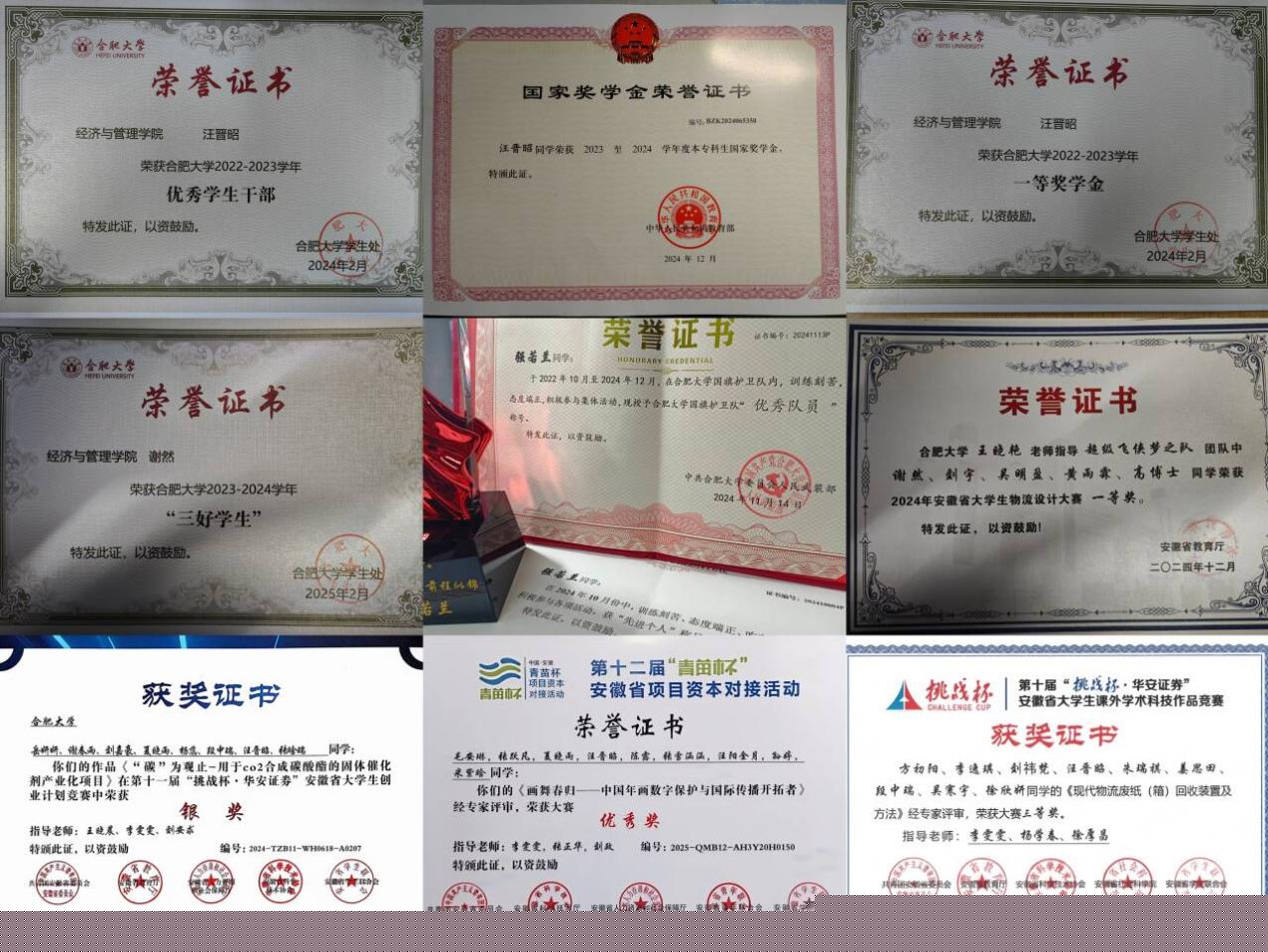 學習上,她們勤勉篤學,銳意進取。寢室長汪晉昭同學擔任班長、輔導員助理,連續兩年綜合測評位列班級第一,獲國家獎學金、校級一等獎學金,更以“優秀學生干部”“三好學生”“優秀團員”等稱號印證全面發展之路,她積極參加學科競賽并獲得省獎十余項、校獎二十余項,學習上認真刻苦,思想上積極向上,工作上嚴謹負責。謝然同學在班級擔任學習委員,曾任南艷青年新媒體中心主編,在學科競賽中斬獲安徽省物流設計大賽一等獎,獲校二等獎學金、三好學生、優秀團員等榮譽稱號,秉持著謙遜的態度,通過不懈的努力不斷進步。強若蘭同學作為班級生活委員,秉持著高度的責任心,細致入微地處理班級各項事務。在學校國旗護衛隊中,她憑借日復一日刻苦訓練磨礪出的過硬素質,從眾多隊員中脫穎而出,擔任副班長一職。訓練時,不僅嚴于律己,更主動幫助新隊員糾正動作、講解要領,以專業的指導和耐心的態度贏得隊員一致認可,獲評“優秀教員”稱號。此外,她在各項任務中始終沖鋒在前,以出色表現榮獲“優秀個人”表彰,成為校園里踐行愛國精神與責任擔當的榜樣。