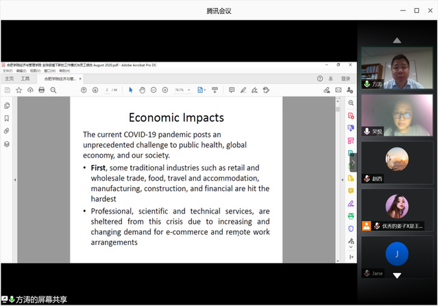8月4日晚,合肥學院特聘教授、加拿大紐芬蘭紀念大學方濤教授為經管學院教師作了一場名為《全球疫情下新的工作模式與員工績效》的學術講座,講座以騰訊會議的線上方式進行。經管學院院長陳江華、副院長吳悅以及30余名教師在線聆聽了整場報告。