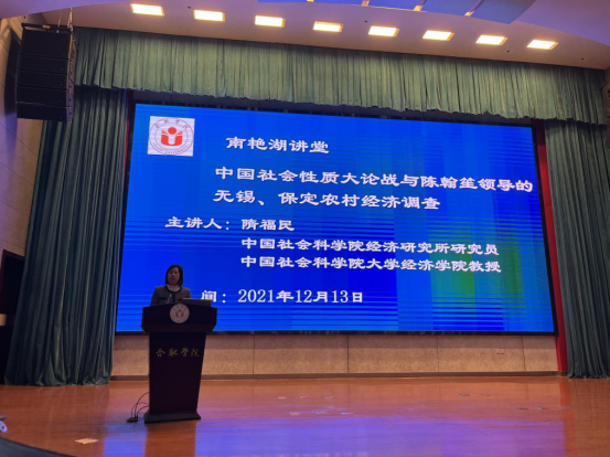 2021年12月13日下午,我校南艷湖大講堂第二講在二期圖書館報告廳A順利舉行中國社會科學院經濟研究所研究、中國社會科學院大學經濟學院教授、博士生導師隋福民作了題為“中國社會性質大論戰與陳瀚笙領導的無錫、保定農村經濟調查”的學術報告。校長吳春梅出席并主持報告會。經濟與管理學院院長陳江華、部分師生以及相關單位教職工出席。