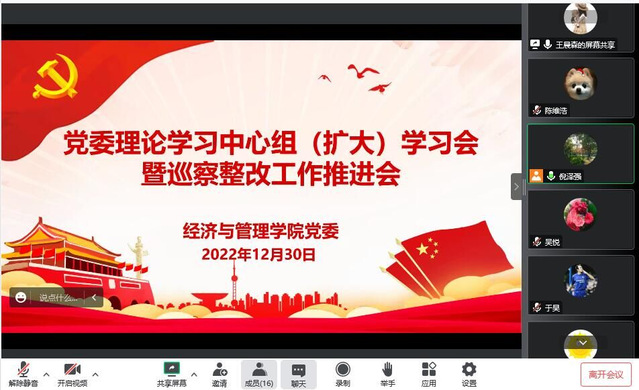 2022年12月30日上午,經(jīng)濟(jì)與管理學(xué)院黨委理論學(xué)習(xí)中心組(擴(kuò)大)學(xué)習(xí)會暨巡察整改工作推進(jìn)會順利召開,采用線上騰訊會議和線下會議相結(jié)合的方式。會議由經(jīng)濟(jì)與管理學(xué)院黨委書記倪澤強(qiáng)主持,經(jīng)濟(jì)與管理學(xué)院院長陳江華、黨委委員、各黨支部書記參與會議。