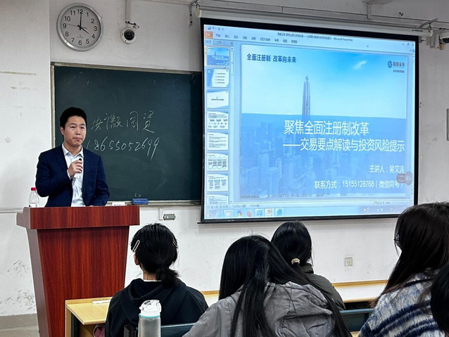 接下來,吳文濤先生就“全面注冊制下適當(dāng)性制度解讀”“交易規(guī)則解讀”和“交易風(fēng)險(xiǎn)與機(jī)遇”這三點(diǎn)分別進(jìn)行了詳細(xì)地分析和說明,讓學(xué)生們更好地應(yīng)對(duì)市場變化與波動(dòng),吸收不同投資領(lǐng)域的知識(shí),學(xué)到更多的投資技能。