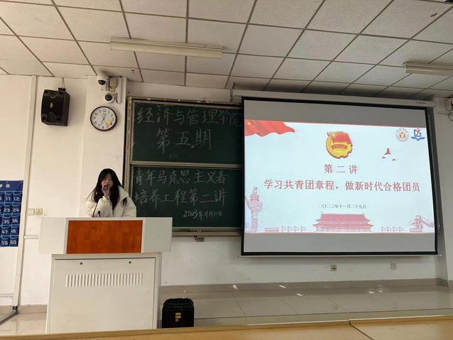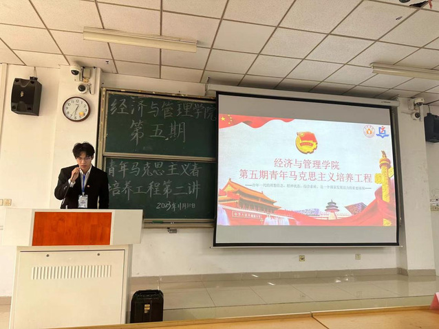 青風不止,博學篤行。為深入學習宣傳貫徹黨的二十大精神,加強對青年大學生的思想政治引領,著力為黨培養和輸送青年政治骨干,2023年11月30日經濟與管理學院第五期青年馬克思主義者培養工程第二講于一期校園五棟101室成功舉行。此次課程由經濟與管理學院團委兼職學生副書記黃戈同學主講,第五屆團委學生會成員與23級新生班干參與學習。