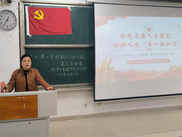 為切實(shí)加強(qiáng)入黨積極分子的培養(yǎng)教育,進(jìn)一步提高黨員素質(zhì)。2023年12月4日中午,經(jīng)濟(jì)與管理學(xué)院分黨校第九期入黨積極分子培訓(xùn)班第五課于一期4棟107教室如期舉行。本次黨課由經(jīng)濟(jì)與管理學(xué)院黨委副書記夏丹青主講,我院全體第九期入黨積極分子參加了此次課程。