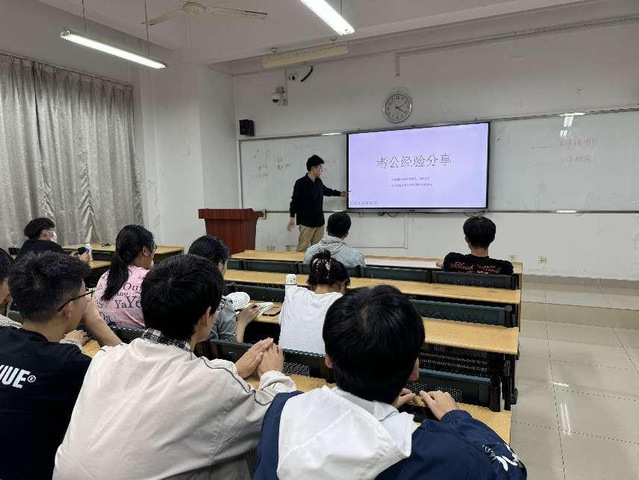 交流會中,唐肖峰同學詳細介紹了考研的成功經驗,段后鳴和趙雨陽同學分別為大家講述了在備考中的注意事項,以及考研失利后的自我調整和找工作的各項準備。蔡嘉、程國慶同學細致地為大家分享考公經驗,激勵大家備考期間不能松懈,同時也強調了考公崗位的多樣性,應當選擇適合的崗位。朱光迪同學從退役大學生士兵身份出發,詳細介紹了退役大學生士兵計劃在考研考公方面的優待政策最后,張星老師對到場參加考研考公交流會的學長學姐表示感謝,希望同學們認真學習總結學長學姐的經驗,樹立正確的就業觀念,鼓勵同學們積極參與校園招聘會,端正就業價值觀。