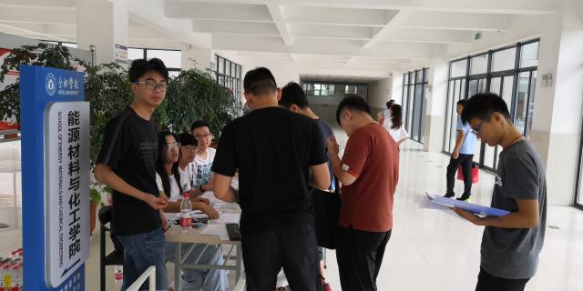 為做好2019級能源材料與化工學院研究生的迎新工作,確保新生順利報到,院成立研究生迎新工作組,提前準備,對迎新工作的各個環節進行了細致周密的安排部署。按照迎新方案,提前通知新生準備研究生入學所需要的畢業證書以及學歷驗證報告等相關材料。早上八點不到,第一名來自南京的學生就來到生化樓報到,在報到臺前有序交齊升學各項材料,領取新生入學報告單和入住單,然后到分配的宿舍報到入住。能源材料與化工學院院長董強、副院長胡坤宏上午前往報道地點,查看報道情況,對志愿者們的工作給予肯定,對報考我校的研究生們表示了歡迎。