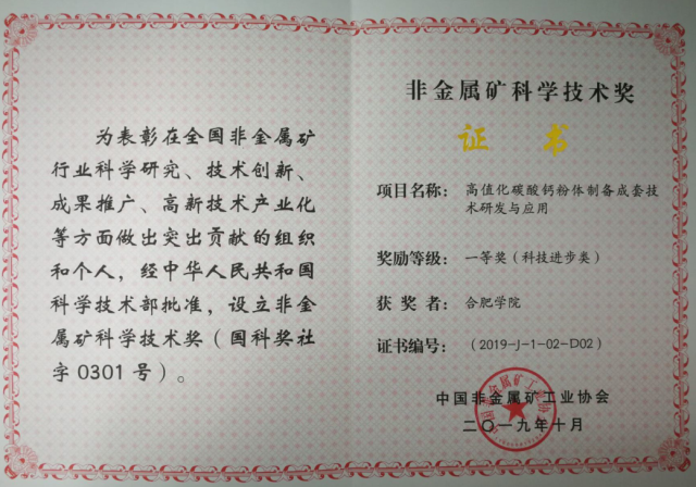 據了解,該獎項是中國非金屬礦行業的最高獎項,是經科學技術部批準的社會力量設立的科學技術獎(國科獎社字0301號),主要是為表彰在全國非金屬礦行業科學研究、技術創新、成果推廣、高新技術產業化等方面做出突出貢獻的組織和個人。另外,秦廣超老師團隊于2019年9月6日在浙江建德召開的全國碳酸鈣行業年會上,喜獲2項全國碳酸鈣行業創新獎。