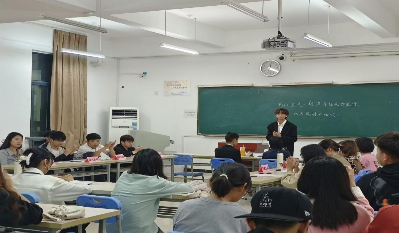 雙方就明知道是一段沒有結(jié)果的愛情,你會(huì)選擇開始嗎?這一辯題開始辯論。比賽開始,雙方互相問好。正方臺(tái)詞式的自我介紹給我們留下了深刻的印象。緊接著正方一辯做立論陳詞,正方觀點(diǎn)為選擇開始這段感情,他的陳述簡(jiǎn)潔且堅(jiān)定己方觀點(diǎn)。緊接著,反方發(fā)表他們的立論陳詞。一瞬間雙方摩擦出了濃濃的火藥味,來到第二回合進(jìn)行一對(duì)一攻辯,正方選手舉出泰坦尼克號(hào)的例子,在資產(chǎn)階級(jí)的壓迫下,他們肯定沒有好的結(jié)果,但是他們還是開始了他們的愛情。并且愛情最后還拯救了rose,讓她活成了真正的自己。反方選手也不甘示弱。反駁道,這個(gè)愛情到最后rose到底是幸福多還是痛苦多呢?幾個(gè)回合下來,雙方打的有來有回,比賽現(xiàn)場(chǎng)更是令人激動(dòng)。觀眾們不自覺地發(fā)出陣陣掌聲。在最后的嘉賓提問環(huán)節(jié)里,無(wú)論是評(píng)委提出的問題還是現(xiàn)場(chǎng)觀眾提出的問題,我們的選手總能給出滿意的答案。在評(píng)委們的仔細(xì)斟酌下,反方獲得本場(chǎng)比賽的勝利,晉級(jí)決賽,最佳辯手為反方二辯。