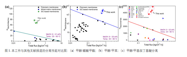 高效分離有機溶劑是化工領域追求的重要目標,而當前有機溶劑的分離主要依賴于高能耗的精餾。在碳達峰、碳中和的“雙碳”發展趨勢下, 發展低能耗、環境友好的膜分離技術具有十分重要意義。該研究通過聚碳硅烷低溫交聯制備亞納米碳化硅用于有機溶劑體系分離,并揭示了交聯和熱解溫度碳化硅膜的孔徑和表面性質的影響,氣體分離屬性液體分離性能相關性(即基于體分離對液體滲透汽化分離性能預測)。實驗表明,膜的分離性能達到了該領域的領先水平(圖1),具有良好的工業化應用前景。