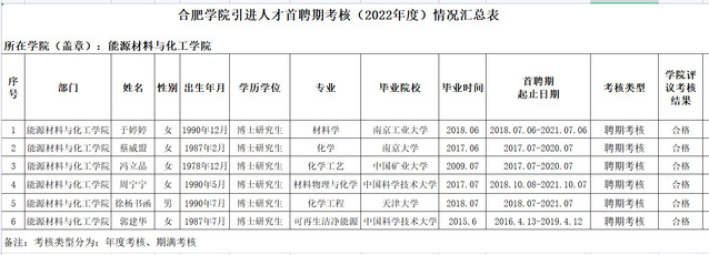 根據個人申報情況,經學院學術委員會審核,院黨委會和黨政聯席會議研究決定,能源材料與化工學院人才引進聘期考核學院評議結果如下: