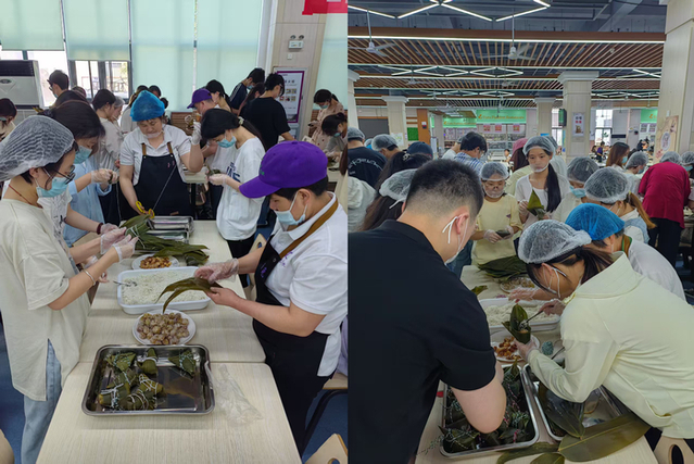 在學生處與后勤集團的聯合組織下,“端午粽動員 巧手制安康”包粽子體驗活動在第二學生食堂舉行。食堂精心準備了粽葉、糯米、肉餡和蜜棗等材料,在師傅的悉心指導下,200多名學生踴躍參與,共包制了2000余個粽子。