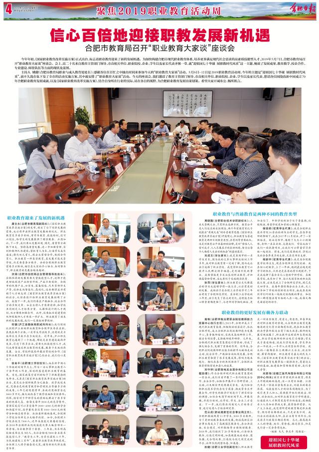 五月的第二周是全國(guó)職業(yè)教育活動(dòng)周,今年恰逢《國(guó)家職業(yè)教育改革實(shí)施方案》正是頒布,職業(yè)教育迎來了新的發(fā)展機(jī)遇。5月7日,合肥市教育局召開了“職業(yè)教育大家談”座談會(huì),教育主管部門、市直單位、職業(yè)院校、學(xué)生以及家長(zhǎng)代表近二十人參會(huì)。會(huì)議由合肥市教育局職成處處長(zhǎng)姚健主持,主題是“迎祖國(guó)七十華誕,展職教時(shí)代風(fēng)采”。我中心高艷主任應(yīng)邀參會(huì)并發(fā)言?!逗戏嗜?qǐng)?bào)》進(jìn)行了整版報(bào)道。