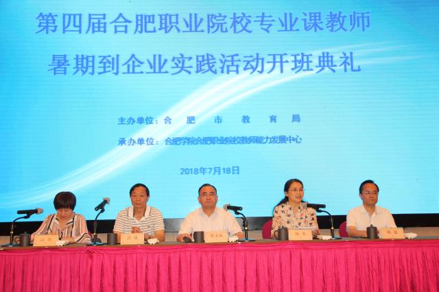 7月18日上午,第四屆合肥職業(yè)院校專業(yè)課教師暑期到企業(yè)實(shí)踐開(kāi)班典禮在白金漢爵酒店舉行,合肥學(xué)院副院長(zhǎng)陳秀、合肥市教育局副局長(zhǎng)唐文水、合肥市教育局職成處處長(zhǎng)姚健、合肥市經(jīng)信委企業(yè)管理指導(dǎo)處處長(zhǎng)洪濤以及參加本屆實(shí)踐活動(dòng)的200余名教師出席典禮。合肥學(xué)院合肥職業(yè)院校教師能力發(fā)展中心主任高艷主持會(huì)議。本次活動(dòng)由合肥市教育局主辦,合肥學(xué)院合肥職業(yè)院校教師能力發(fā)展中心承辦。 合肥學(xué)院副院長(zhǎng)陳秀首先致辭。她介紹了學(xué)校發(fā)展建設(shè)情況,特別是中德教育合作示范基地和地方應(yīng)用型高水平大學(xué)的建設(shè)情況。其次,她分享了學(xué)校在加強(qiáng)校企合作,培養(yǎng)“雙能型”教師方面的經(jīng)驗(yàn)做法。陳秀副院長(zhǎng)結(jié)合合肥學(xué)院合肥職業(yè)院校教師能力發(fā)展中心近年來(lái)開(kāi)展的工作,著重介紹了“理論學(xué)習(xí)——企業(yè)實(shí)踐——高端研修——教學(xué)科研實(shí)踐——再學(xué)習(xí)提升”的專業(yè)課教師循環(huán)培養(yǎng)培訓(xùn)新模式。接下來(lái),她介紹了本屆到企業(yè)實(shí)踐活動(dòng)的前期準(zhǔn)備情況及創(chuàng)新探索工作。最后,她對(duì)本屆到企業(yè)實(shí)踐活動(dòng)的組織服務(wù)工作提出了殷切希望,對(duì)各方的努力表示感謝,并祝活動(dòng)圓滿成功。 合肥市工程技術(shù)學(xué)校教師靳安翔代表學(xué)員做了發(fā)言。他希望通過(guò)到企業(yè)實(shí)踐學(xué)習(xí),不斷反思,將理論與實(shí)踐相結(jié)合,切實(shí)提高理論水平。合肥美菱股份有限公司人力資源部人才發(fā)展主管房勝永代表企業(yè)發(fā)言,他提出理論知識(shí)要與企業(yè)生產(chǎn)、市場(chǎng)環(huán)境緊密結(jié)合,實(shí)現(xiàn)校企合作的多方共贏。  合肥市經(jīng)信委企業(yè)管理指導(dǎo)處處長(zhǎng)洪濤向參訓(xùn)教師表示熱烈歡迎,并期望通過(guò)暑期實(shí)踐活動(dòng),職業(yè)院校教師與企業(yè)人員能夠共同學(xué)習(xí)、共同進(jìn)步,共同織就校企合作、產(chǎn)教融合的紐帶。 合肥市教育局副局長(zhǎng)唐文水最后講話。他首先回顧了近幾年職業(yè)院校專業(yè)課教師暑期到企業(yè)實(shí)踐活動(dòng)的開(kāi)展情況,闡述了活動(dòng)的重要意義,鼓勵(lì)行業(yè)企業(yè)積極參與職業(yè)教育。唐局長(zhǎng)指出,要以十三五規(guī)劃中的產(chǎn)教融合為主題,切實(shí)落實(shí)產(chǎn)教融合、校企合作的指標(biāo)任務(wù);推動(dòng)應(yīng)用型人才培養(yǎng)體系的建設(shè),推進(jìn)專業(yè)設(shè)置與生產(chǎn)實(shí)際的對(duì)接;加強(qiáng)職業(yè)院校教師能力提升,構(gòu)建有合肥特色的現(xiàn)代職業(yè)教育體系。最后,唐文水副局長(zhǎng)希望到企業(yè)實(shí)踐活動(dòng)能夠增進(jìn)企業(yè)與學(xué)校的合作交流,搭建校企溝通的重要橋梁。 開(kāi)班典禮之后,合肥市教育局、合肥學(xué)院合肥職業(yè)院校教師能力發(fā)展中心邀請(qǐng)專家,為參訓(xùn)學(xué)員進(jìn)行了為期兩天半的集中理論培訓(xùn)。中國(guó)職教學(xué)會(huì)教學(xué)工作委員會(huì)主任王軍偉教授從新時(shí)代、新視角、新舉措等角度,分析了如何深化職業(yè)教育教學(xué)改革,全面提高人才培養(yǎng)質(zhì)量。安徽省職業(yè)與成人教育協(xié)會(huì)會(huì)長(zhǎng)李興旺教授闡述了現(xiàn)代職業(yè)教育的基本特征,歸納出產(chǎn)教融合是現(xiàn)代職業(yè)教育發(fā)展的必然要求,提出構(gòu)建教育和產(chǎn)業(yè)深度融合、加強(qiáng)“雙師”型師資隊(duì)伍建設(shè)的觀點(diǎn)。合肥市教育科學(xué)研究院副院長(zhǎng)戈弋則從德、能、勤、績(jī)四方面深入分析,闡述了新時(shí)代對(duì)教師隊(duì)伍的新要求。合肥幼兒師范教務(wù)處處長(zhǎng)孫玉教授從選題、申報(bào)、成果凝練等方面闡述了教學(xué)成果獎(jiǎng)申報(bào)的有關(guān)事宜。合肥鐵路工程學(xué)校陳世龍教授對(duì)職業(yè)院校技能大賽的現(xiàn)狀、流程和產(chǎn)生的積極效應(yīng)做了詳細(xì)的分析介紹,并結(jié)合參賽經(jīng)驗(yàn)提供了相關(guān)對(duì)策建議。集中理論培訓(xùn)的開(kāi)展,為即將進(jìn)行的企業(yè)實(shí)踐活動(dòng)打下了理論基礎(chǔ),指導(dǎo)了職校教師今后的教學(xué)、科研、競(jìng)賽等項(xiàng)工作的開(kāi)展。 第四屆合肥職業(yè)院校專業(yè)課教師暑期到企業(yè)實(shí)踐活動(dòng)開(kāi)班典禮暨集中理論培訓(xùn)于7月20日?qǐng)A滿結(jié)束,之后,來(lái)自24所職業(yè)院校的211名老師將按照學(xué)科專業(yè)的不同,分組前往26家企業(yè)進(jìn)行暑期實(shí)踐。合肥職業(yè)院校專業(yè)課教師暑期到企業(yè)實(shí)踐活動(dòng)由合肥市教育局組織,合肥學(xué)院合肥職業(yè)院校教師能力發(fā)展中心承辦,2015年開(kāi)始舉辦,至今年暑期,有800多人次在企業(yè)進(jìn)行了為期一個(gè)月的實(shí)踐鍛煉。實(shí)踐活動(dòng)加強(qiáng)了理論與實(shí)踐的聯(lián)系,提升了教師的能力水平,拉近了校企之間的距離,促進(jìn)了產(chǎn)教融合的開(kāi)展
