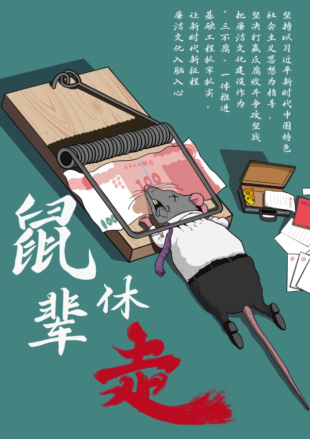 作品圍繞“反腐廉潔”進行創作,運用了三位手工藝人的形象對貪污腐敗的人進行反諷;將腐敗不正之風的人不會有的生活方式直接寫了出來,同時使用扁平畫的風格將生活中最樸素人物的真實的狀態表現出來,字體偏手寫風格,充滿親和力,“廉潔”兩字使用紅色更加突出。
