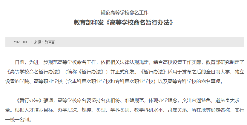 日前,為進一步規范高等學校命名工作,依據相關法律法規規定,結合高校設置工作實際,教育部研究制定了《高等學校命名暫行辦法》(簡稱《暫行辦法》)并正式印發。《暫行辦法》適用于發布之后的全日制大學、獨立設置的學院、高等職業學校(含本科層次職業學校和專科層次職業學校)以及高等專科學校的命名事項。