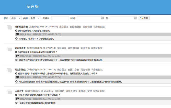 學校招生信息網及時更新各板塊內容,讓考生既可輕松快捷地了解到學校的基本概況、校園生活、特色品牌專業,又可方便查詢到學校歷年來錄取分數線等信息,此外,網站通過在線留言板同步接受考生咨詢。同時,各二級學院的網站也及時進行了信息更新。