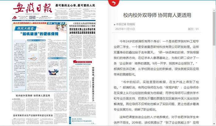 “書中的知識、實驗室里的數據,在生產線上得到了檢驗。”郎滿權說,有兩位導師在為他“保駕護航”:企業導師會在實操上從行業經驗的角度為他答疑;而學校導師可以提供學術和專業方面支持,把原先不懂的原理在實際案例中深入淺出地講解清楚。兩位導師不僅幫助他解決了實際問題,更讓他逐步看清專業發展方向,明晰了職業規劃。