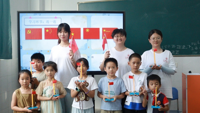 7月7日下午,合肥大學教育學院“同筑鄉村夢,共‘育’振興果”志愿服務隊在合肥市小廟鎮蜀山行知學校開展了暑期“三下鄉”社會實踐活動。教師黃秋語給孩子們帶來一堂理論與實踐相結合的愛國主義教育課,讓孩子們認識我國不同種類的旗幟并了解它們背后的故事。