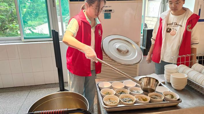 4月25日至30日每日午餐、晚餐時(shí)段,教育學(xué)院志愿者團(tuán)隊(duì)在校園一期食堂開展“文明餐桌”專項(xiàng)服務(wù)。活動(dòng)期間,志愿者們身著統(tǒng)一的紅色馬甲,分工明晰、配合默契,積極投身于各項(xiàng)服務(wù)工作中。 志愿者在打湯處手持長柄勺,主動(dòng)為師生盛湯遞餐,一句句“同學(xué)請小心燙”“老師需要加湯嗎”傳遞著關(guān)懷;志愿者手持抹布穿梭于餐桌間,及時(shí)清理殘?jiān)⒉潦门_面,為用餐師生營造整潔環(huán)境;志愿者在餐盤回收處引導(dǎo)師生分類投放垃圾幫助食堂工作人員一起清理回收處的衛(wèi)生。