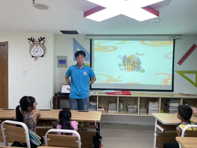 新疆,是創(chuàng)世者在勾勒山河畫卷時(shí)格外偏愛(ài)的地方。逶迤雪山,廣袤草原;浩瀚沙漠,蒼茫戈壁。種種山河盛況,在這里展露。新疆,是一片跳動(dòng)著音符的土地,這里的人們能歌善舞,輕快急促的音樂(lè),旋轉(zhuǎn)舞動(dòng)的裙擺構(gòu)成了極具風(fēng)情的新疆文化。本節(jié)課,志愿者將新疆音樂(lè)帶進(jìn)課堂,通過(guò)學(xué)習(xí)民歌《青春舞曲》來(lái)讓孩子們感受新疆文化。課程伊始,志愿者先用一則小短片帶孩子們走進(jìn)美麗的新疆,輕快動(dòng)感的音樂(lè)在教室上空環(huán)繞。