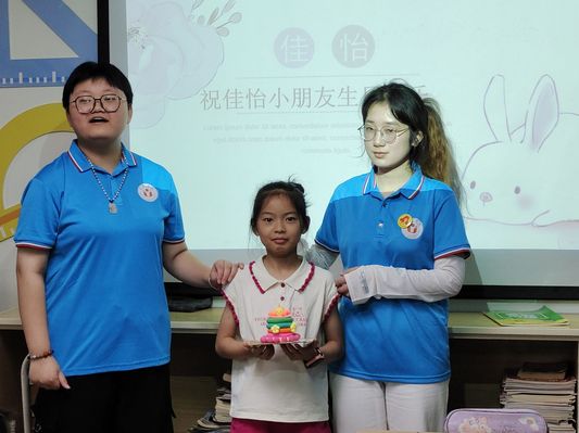 按下的快門合照也折射出孩子們五彩斑斕的記憶。團隊成員王欣悅放映了她為小朋友制作的生日祝?;脽羝?,并且和在場的其他成員一起帶領著小朋友共同為沈佳怡歌唱《祝你生日快樂》。教室溫馨的氛圍在音符的跳動中更是添上了一抹活躍的色彩。團隊成員還為佳怡小朋友送上了小零食,表達了真摯的祝福,希望她能夠健康快樂地成長?;顒拥淖詈?,志愿者們與小朋友一同合影留念,記錄下這個美好的瞬間。