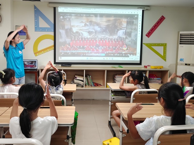 75日上午,合肥學院教育學院“七彩童年,‘育’你相伴”志愿團隊前往合肥市包河區濱湖和園社區開展“三下鄉”社會實踐活動。為讓同學們了解并學習手語,王玉、楊明月兩位志愿者為同學們帶來《國家》這首歌曲的手語舞蹈課。