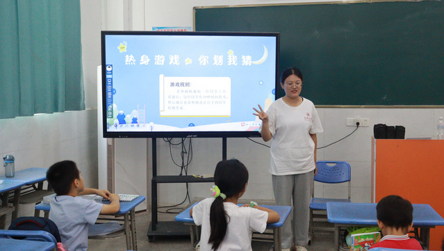 默契大考驗,預(yù)熱情緒之旅。在課程正式開始之前,老師組織了一場“你劃我猜”的趣味小游戲來集中小朋友們的注意力,一位小朋友上臺用肢體和語言來描述自己看到的詞語,臺下的小朋友們猜是什么詞語。老師通過游戲激發(fā)小朋友們對課程內(nèi)容的興趣,使他們在輕松愉快的氛圍中進(jìn)入課堂學(xué)習(xí)狀態(tài)。