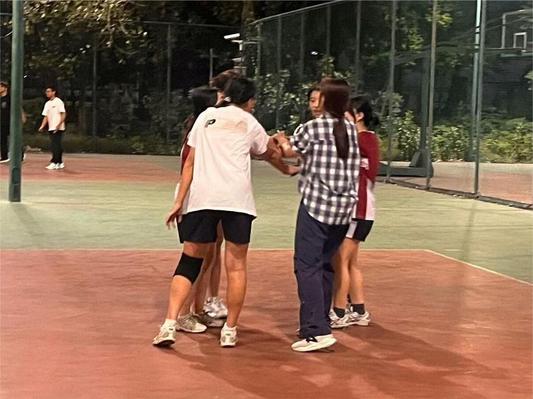 比賽哨聲響起,雙方隊員迅速進入狀態。教育學院女排開場扣殺驚人,只見隊員高高躍起,手臂如強弓般拉開,將排球狠狠擊出,排球如閃電般飛向對方場地,令對手措手不及,瞬間點燃現場熱情。外國語學院女排也毫不示弱,她們迅速穩住陣腳,積極應對。第一輪比賽在教育學院女排一次次成功扣殺下,以26:24取得首勝。