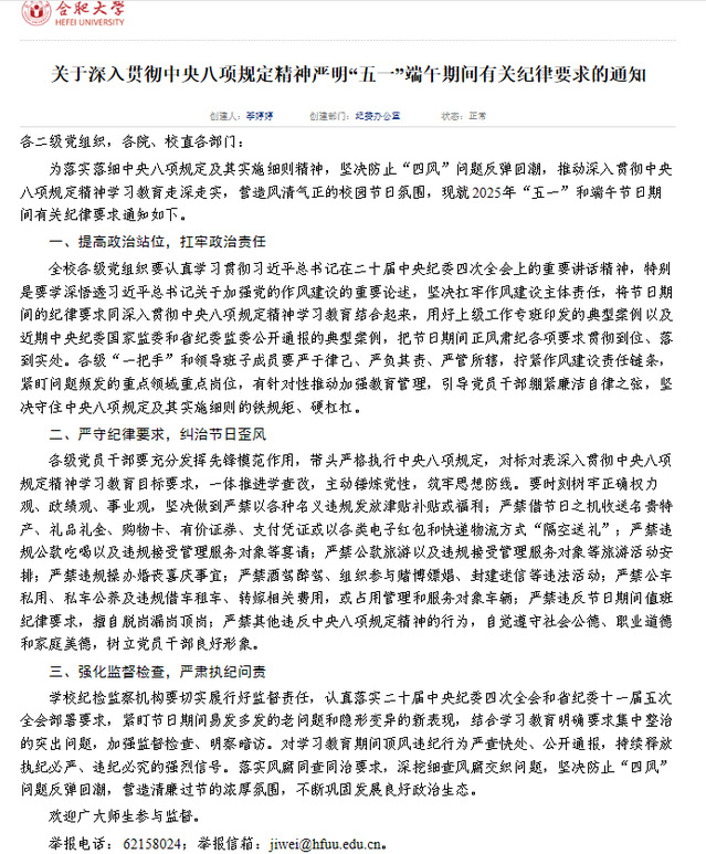 各黨組織,各部門:現將中共合肥大學紀律檢查委員會、省監委駐合肥大學監察專員辦公室《關于深入貫徹中央八項規定精神嚴明“五一”端午期間有關紀律要求的通知》轉發給你們,請認真學習領會,嚴格執行有關規定。關于深入貫徹中央八項規定精神嚴明“五一”端午期間有關紀律要求的通知