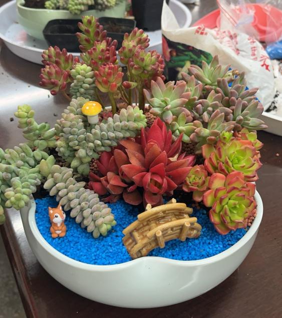 學(xué)院提前準(zhǔn)備了虹之玉、生石花、玉露等種多肉植物及創(chuàng)意花器。在專業(yè)園藝師指導(dǎo)下,大家化身"綠植設(shè)計(jì)師",精心搭配不同品種的多肉,鋪陶粒、填營養(yǎng)土、設(shè)計(jì)造型,最后以彩色砂石點(diǎn)綴。學(xué)院黨委書記李秀娟笑道:"沒想到科研人的手既能操作精密儀器,也能打造微觀生態(tài)景觀!"活動現(xiàn)場歡聲笑語不斷,一盆盆造型別致的多肉作品逐漸成型,展現(xiàn)出教師們獨(dú)特的審美情趣。