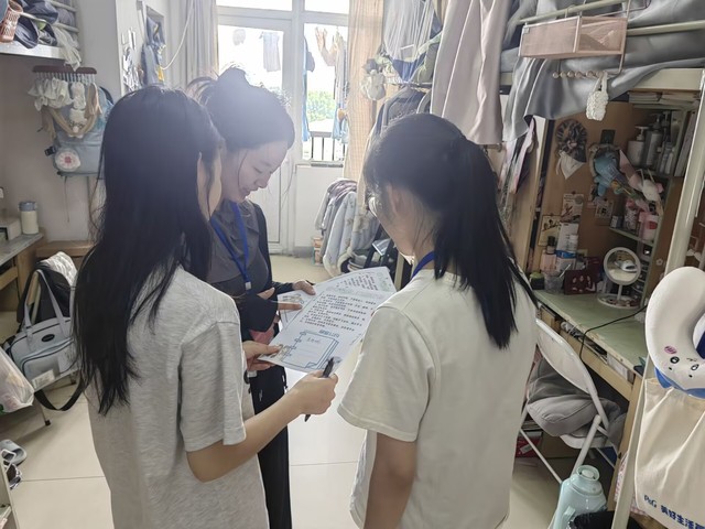 活動前期,14名發展對象設計了《宿舍公約》手冊,包括健康作息、潔身護公、遵守紀律、環境衛生、營造良好學習氛圍、文明共處六個方面,并且讓宿舍全體同學簽上自己的姓名。同時發展對象通過逐個宿舍發放宿舍公約并進行宣傳,針對大三和大四的學生還貼心地準備了合肥市就業政策指導手冊和心理健康安全書冊。在活動中,各發展對象對宿舍的地面、桌面、床鋪、衛生間等各個區域進行了檢查,對于衛生狀況較差的宿舍,現場提出意見。此外,發展對象還與同學進行了交流,傾聽他們在學習、生活中遇到的問題,并認真做好記錄。