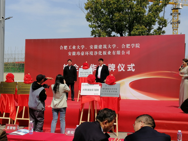 篤行致遠,協同發展,為促進產教深度融合,2023 4 8日上午,合肥學院聯合合肥工業大學、安徽建筑大學與安徽瑋豪環境凈化板業有限公司校企合作揭牌儀式在長豐縣楊廟鎮安徽瑋豪廠區隆重舉行。儀式現場嘉賓云集,智者如云,合肥工業大學黨委常委、副校長季益洪,安徽省農業農村廳鄉村產業處一級調研員呂健魁,長豐縣副縣長安鑫,長豐縣楊廟鎮黨委書記武林以及眾多高校領導教授、政府領導、特邀嘉賓等共同見證這一重要時刻。合肥生物食品與環境學院院長阮班鋒向安徽瑋豪進行了“大學生實習就業基地”的授牌,并合影留念。
