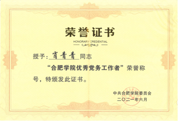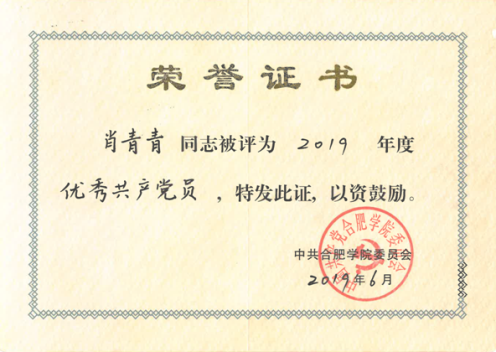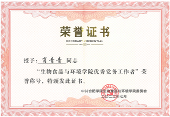 肖青青,女,博士,副教授,1984年生。2014年博士畢業(yè)于中山大學(xué),20151月至20177月進入安徽省農(nóng)業(yè)科學(xué)院工作,任助理研究員,20178月進入合肥學(xué)院生物食品與環(huán)境學(xué)院工作,兼任2017級碩士研究生輔導(dǎo)員,20189月至今擔(dān)任生物食品與環(huán)境學(xué)院食品質(zhì)量與安全教工黨支部書記,201812月被評為副教授,20201月以來同時擔(dān)任食品工程系主任、食品質(zhì)量與安全專業(yè)負責(zé)人。20178月至今在合肥學(xué)院生物食品與環(huán)境學(xué)院食品質(zhì)量與安全專業(yè)工作,2018年擔(dān)任食品質(zhì)量與安全教工黨支部書記,2020年擔(dān)任食品工程系主任、食品質(zhì)量與安全專業(yè)負責(zé)人。在社會學(xué)術(shù)團體層面,2015年被評為國家油料作物質(zhì)量安全風(fēng)險評估崗位專家,2020年安徽省農(nóng)產(chǎn)品安全專業(yè)委員會理事,2021年合肥市食品行業(yè)協(xié)會理事。以下是肖青青同志的個人事跡具體情況: