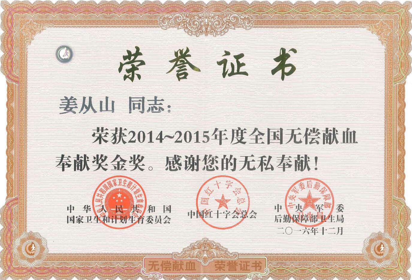 十二年來,姜叢山老師工作上兢兢業業,努力言傳身教,將很多學生認為枯燥無味的思政課變得生動有趣。他在公益上心懷善念,助人為樂。2011年起,他開始參加無償獻血活動,這一堅持就是 7個年頭,從獻全血到堅持 14天捐獻一個單采血小板,獻血總量已達兩萬毫升。在他的眼里,對白血病人、大出血、放化療病人都充滿了大愛。在無償獻血的路上,在志愿服務的第一線,已經55歲的姜從山依然默默地奉獻著,他表示:“現在獻血的人社會壓力很大,有來自家庭的反對,也有來自社會人士的嘲笑。但我從來不去想這些,只要覺得自己是對的,我就會堅持去做,而且我希望這個社會是一種人人為我,我為人人的社會。”姜叢山老師曾榮獲2014-2015年度 “全國無償獻血奉獻獎金獎”、2016-2017年度 “全國無償獻血奉獻獎銀獎”。